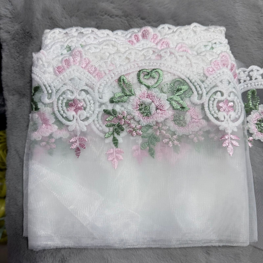 নতুন মেশ এমব্রয়ডারি লেস—নরম ও স্বচ্ছ মেশ ফেব্রিকের উপর করা সূক্ষ্ম ডিটেইলিং এই লেসটিকে করে তুলেছে অত্যন্ত আকর্ষণীয় ও প্রিমিয়াম। গোলাপি ও সবুজ ফুলেল এমব্রয়ডারি ডিজাইন আপনার যেকোনো ড্রেস, কামিজ, কুর্তি, শাড়ির পাড় বা হাতার কাজে দেবে একটি এলিগ্যান্ট ও বিলাসবহুল লুক।