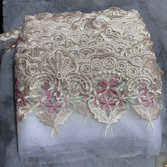 নতুন মেশ এমব্রয়ডারি লেস—নরম ও স্বচ্ছ মেশ ফেব্রিকের উপর করা সূক্ষ্ম ডিটেইলিং এই লেসটিকে করে তুলেছে অত্যন্ত আকর্ষণীয় ও প্রিমিয়াম। গোলাপি ও সবুজ ফুলেল এমব্রয়ডারি ডিজাইন আপনার যেকোনো ড্রেস, কামিজ, কুর্তি, শাড়ির পাড় বা হাতার কাজে দেবে একটি এলিগ্যান্ট ও বিলাসবহুল লুক।